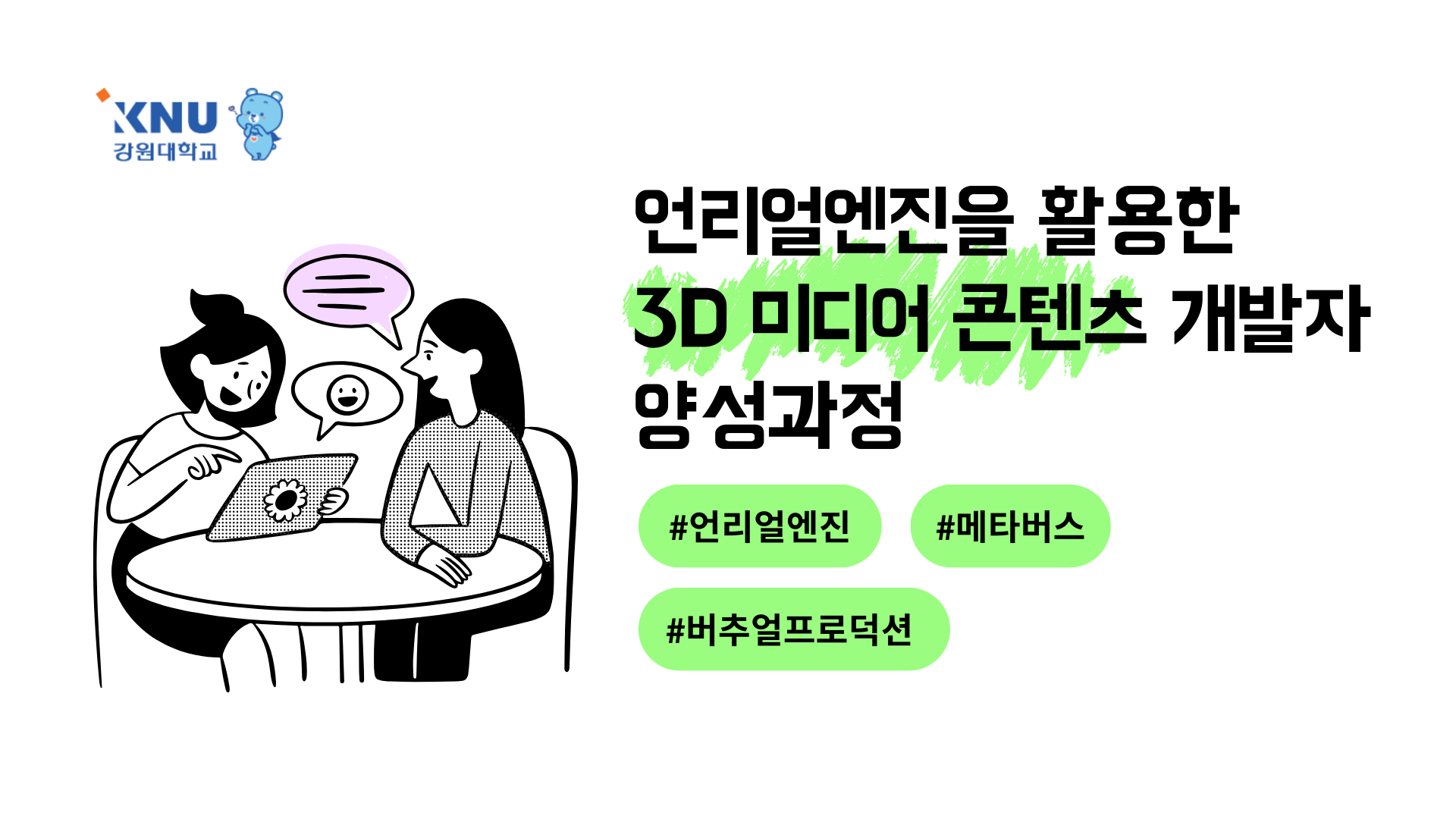 본 과정은 전액 무료 과정으로 고용노동부가 청년 취업희망자를 대상으로 실시하는 실무 프로젝트 중심 K-Digital Training 교육입니다. VR/AR기술기반의 실감형콘텐츠 제작전문과 교육과 실무제작 기술을 함양하고 산업현장에서 바로 적용할 수 있는 능력을 갖출 수 있도록 지원하고 있습니다. ICT 기업 참여 실무 프로젝트를 통해 비전공자라도 IT전문가로 취업할 수 있으니 지금 바로 지원해보세요